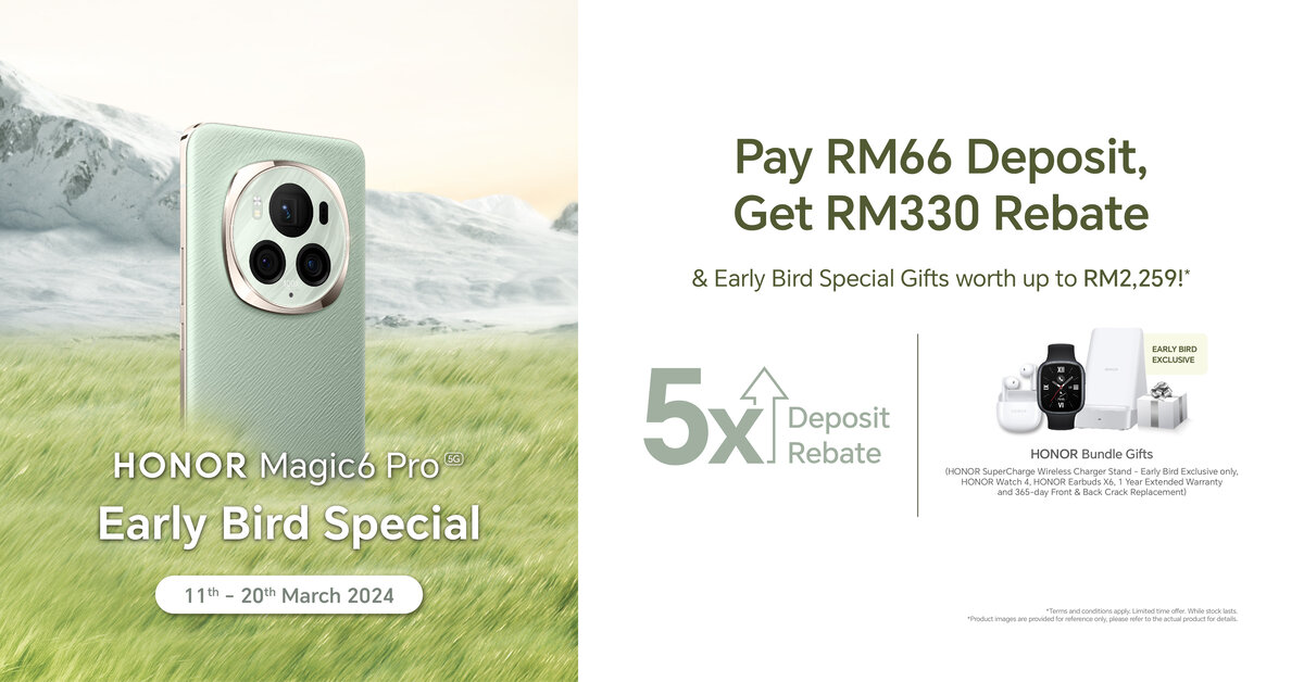 Sementara itu, HONOR menawarkan bayaran deposit sebanyak RM66 untuk menempah HONOR Magic6 Pro menerusi tawaran awal Early Bird Special yang bermula hari ini hingga 20 Mac.