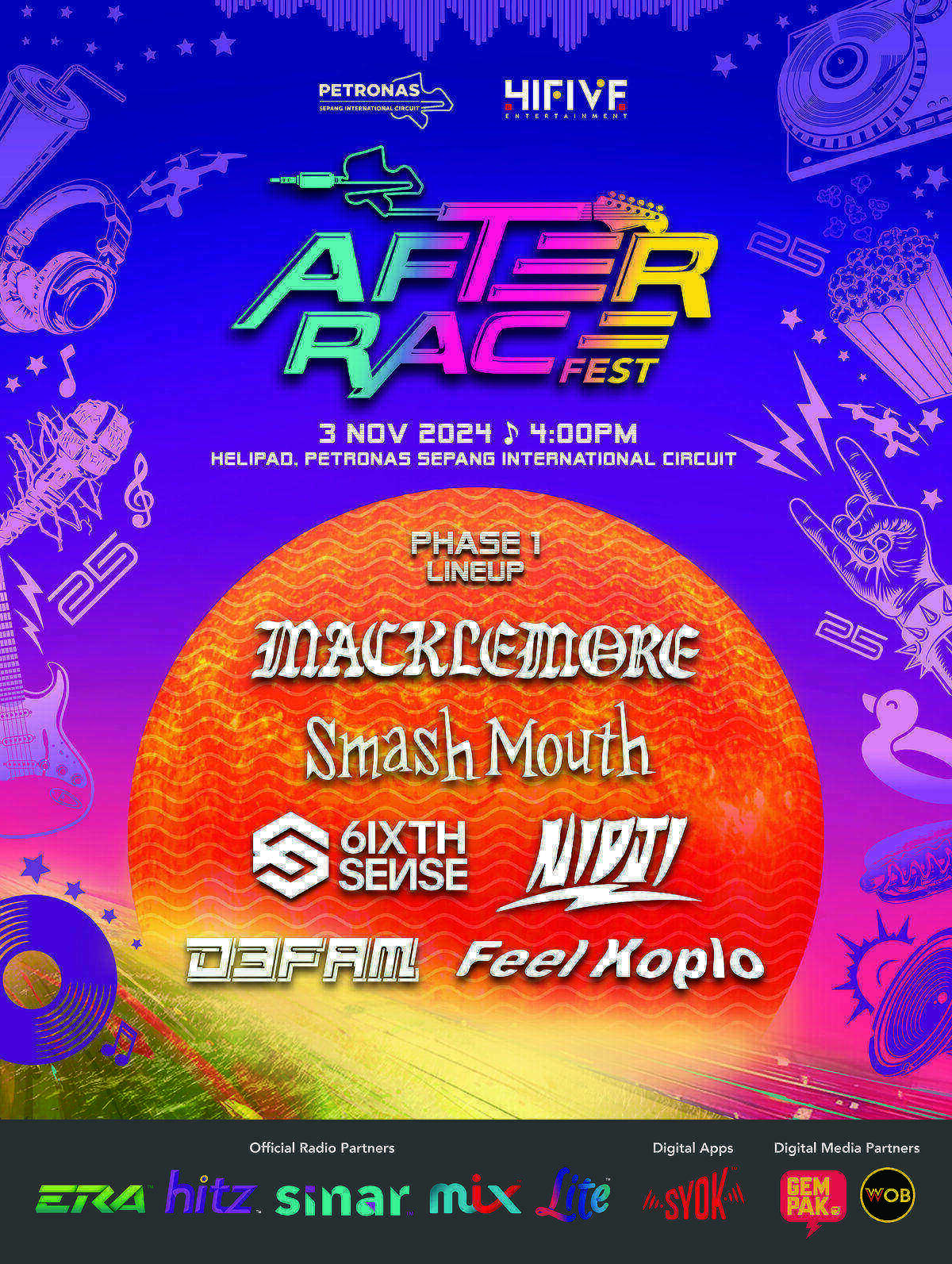 Smash Mouth dan Macklemore juga akan ditemani rakan penghibur yang tidak kurang hebatnya termasuk Nidji dan Feel Koplo (Indonesia), 6ixth Sense dan DE FAM adalah Phase 1 (fasa 1) yang akan melengkapkan erti pesta dalam AFTER RACE FEST.