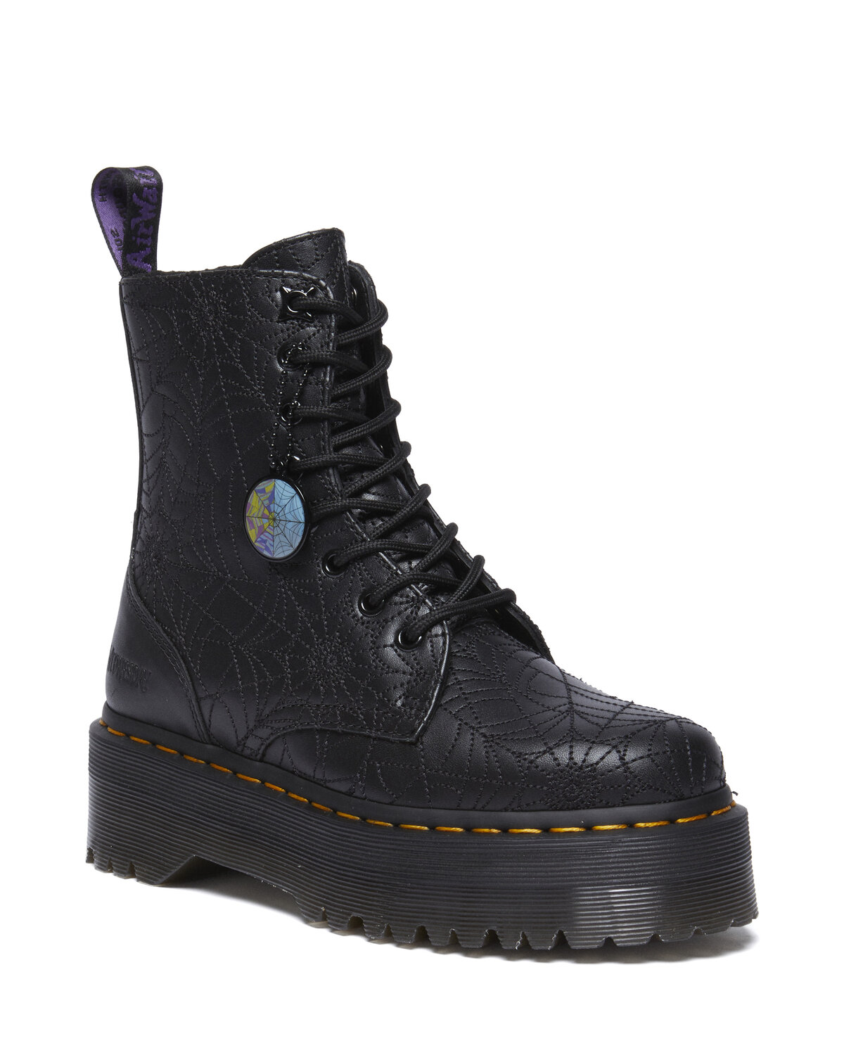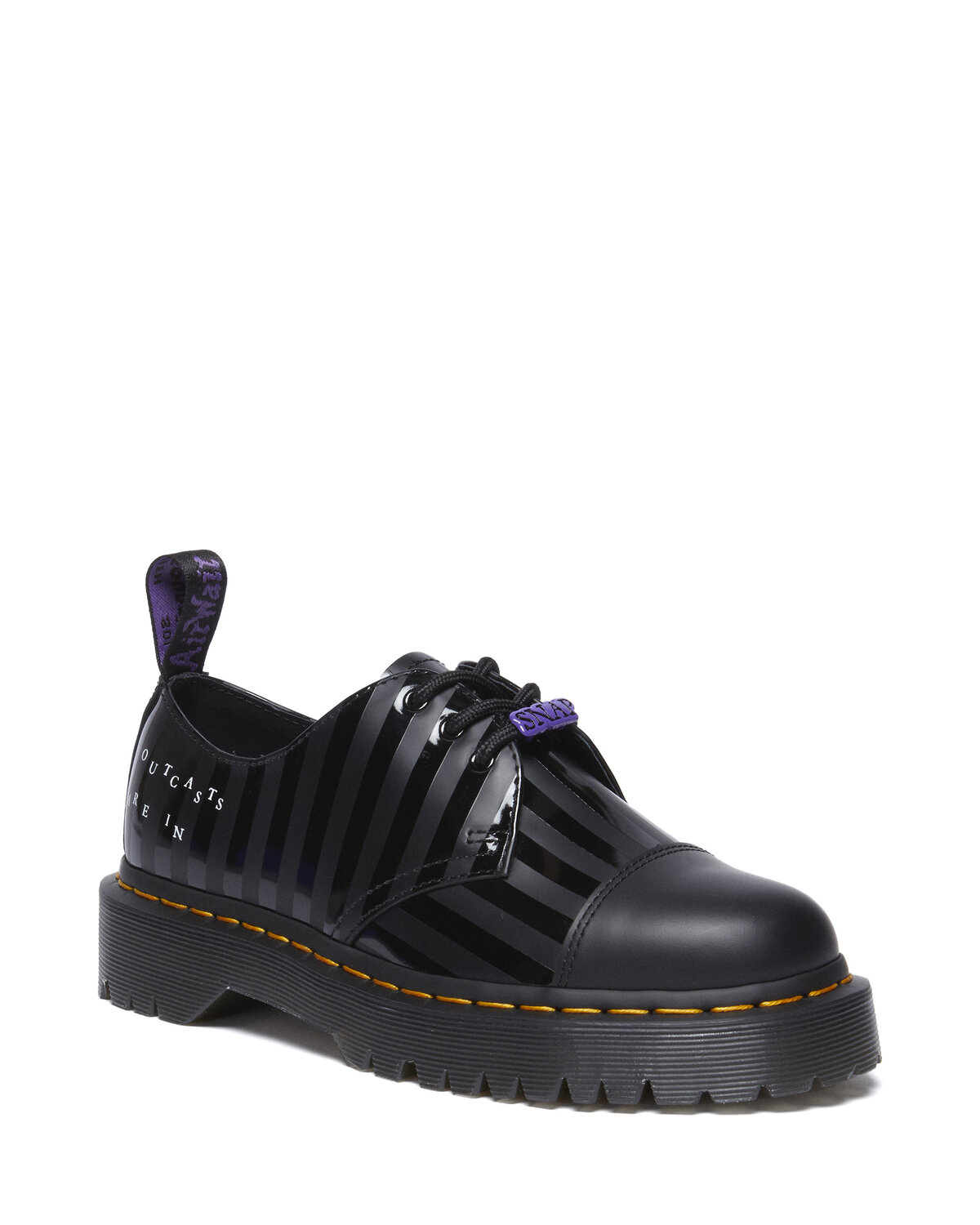 Tapak Quad disatukan dengan jahitan kuning ikonik Dr. Martens, dan gelung tumit diperkemas dengan skrip ungu.