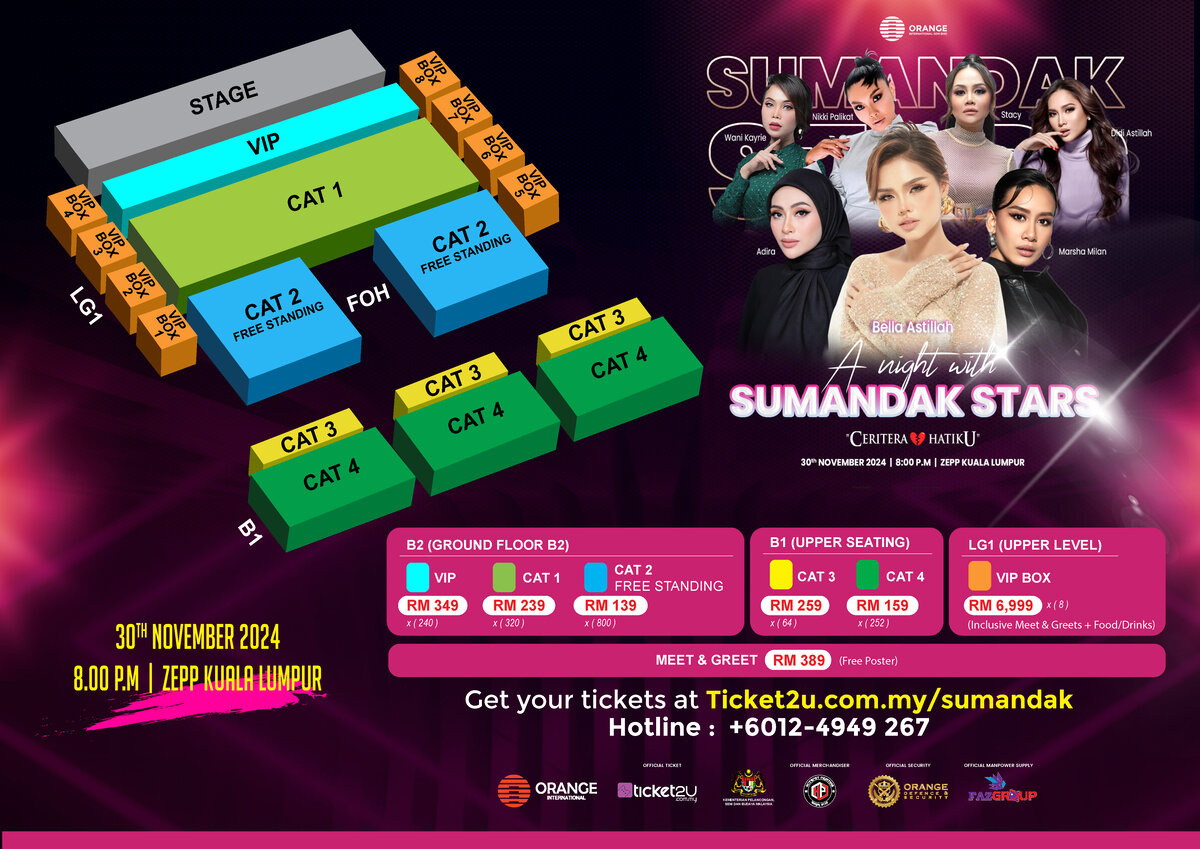 Untuk maklumat lanjut dan pembelian tiket konsert, lawati laman web Ticket2u.com.my/sumandak atau hubungi talian hotline +6012-4949 267, manakala harga-harga tiket adalah seperti berikut: VIP [Special Seating] – RM349, Cat 1 [Normal Seating] – RM239, Cat 2 [Free Standing] – RM139, Cat 3 [Normal Seating] – RM259, Cat 4 [Normal Seating] – RM159, VIP Box-RM6999