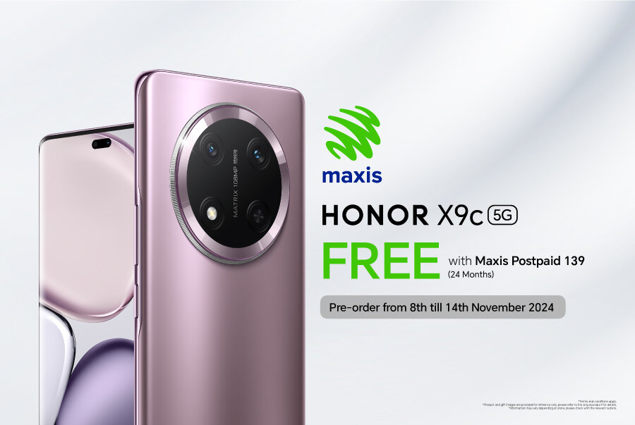 Selain itu, HONOR X9c 5G juga tersedia untuk pra-tempahan dengan Maxis sehingga 14 November 2024. Lebih istimewa, HONOR X9c 5G boleh didapati secara PERCUMA menerusi pelan Maxis Postpaid 139 dengan kontrak 24 bulan! Untuk maklumat lanjut mengenai pelan ini, layari laman web rasmi Maxis.