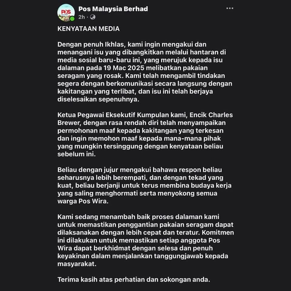 KUALA LUMPUR – Ketua Pegawai Eksekutif Kumpulan Pos Malaysia Berhad, Charles Brewer, tampil membuat permohonan maaf secara terbuka susulan kenyataannya berhubung isu pakaian seragam kakitangan syarikat itu yang dilaporkan rosak, baru-baru ini.