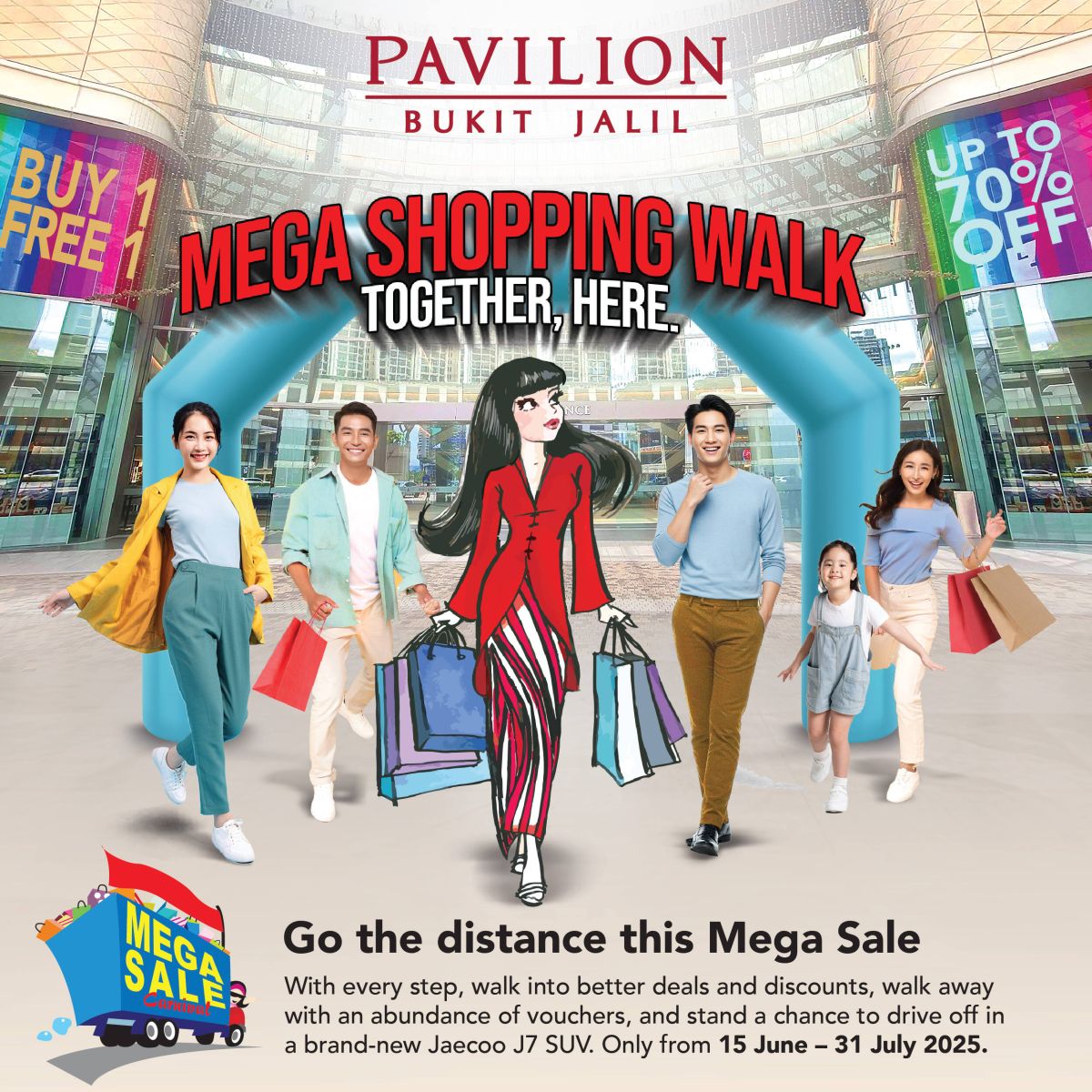 Dengan semangat perpaduan dan keterangkuman, Pavilion Bukit Jalil menjemput orang ramai untuk menyertai “Mega Shopping Walk. Together, Here.” sebuah seruan untuk berjalan bersama, meraikan bersama dan mencipta memori indah dalam semangat kebersamaan rakyat Malaysia.