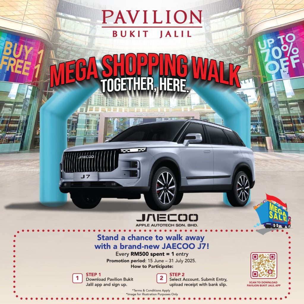 Bagi mereka yang berbelanja RM500 dan ke atas, peluang terbuka untuk menyertai cabutan bertuah yang menawarkan hadiah utama berupa sebuah kereta JAECOO J7 serba baharu.