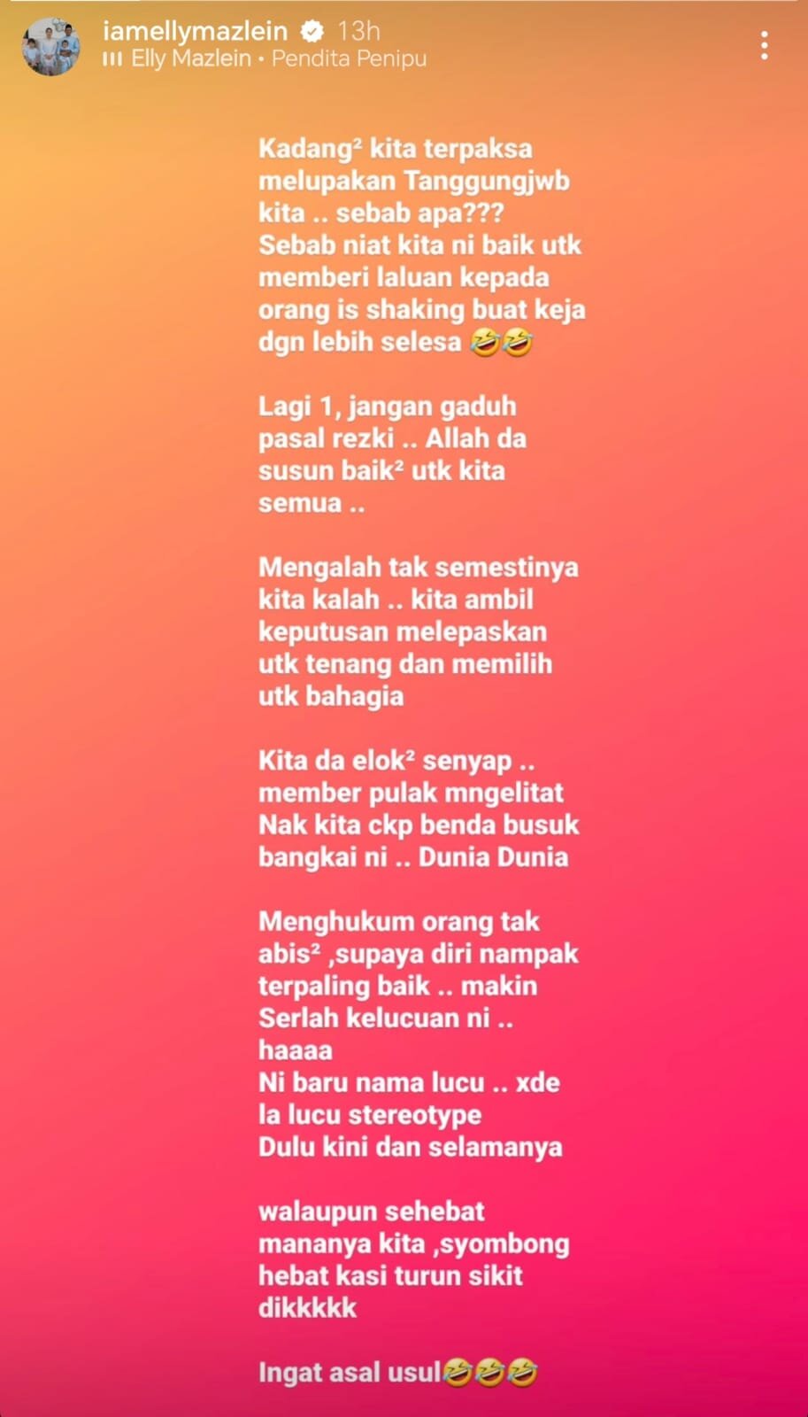 “Setiap orang mempunyai pemikiran sendiri, kita tidak boleh menghalang apa yang mereka fikir, tapi kita mempunyai akal untuk jadi ‘penapis’ apa yang baik dan buruk, bila kita menguasai ilmu, kita akan menghayati kehidupan,” katanya.